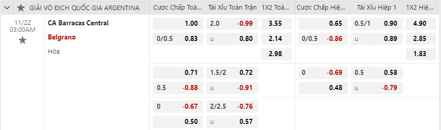 Soi kèo châu Á Barracas Central vs Belgrano: 0.71*-0.5*0.88