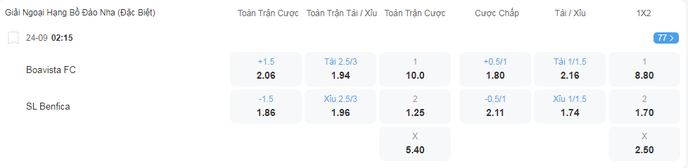 Tỷ lệ kèo Boavista vs Benfica