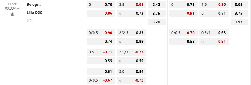 Soi kèo hiệp 1 Bologna vs Lille: 0.73*0*0.91