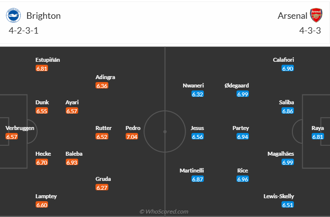 Brighton là đội để hòa nhiều nhất cho đến thời điểm này của mùa giải, họ hòa đến 9 trận trong đó 3 trận gần nhất đều hòa. 6 vòng gần nhất đội bóng này không thể thắng nhưng không dễ để đội khác đánh bại họ. Vị trí thứ 10 trên bảng xếp hạng không phải kết quả tệ của thầy trò HLV Fabian Hürzeler nhưng họ muốn nhiều hơn thế. Muốn vậy thì các cầu thủ Brighton cần giành chiến thắng chứ không thể tiếp tục chuỗi trận như vừa qua. Tuy nhiên trước đối thủ mạnh như Arsenal ở vòng 20 thì cơ hội có 3 điểm không cao, nhiều khả năng Brighton sẽ chơi đầy cố gắng và có thêm một trận hòa nữa.