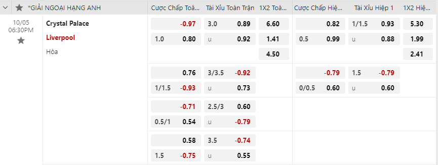 Soi kèo châu Á Crystal Palace vs Liverpool