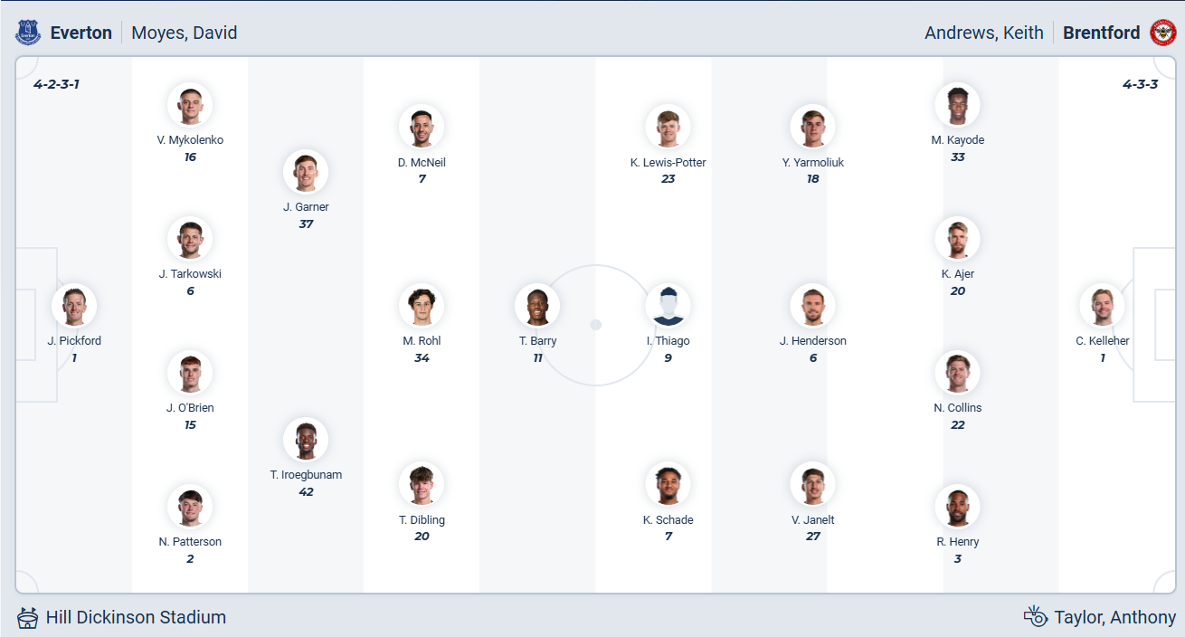 Brentford kém Everton 1 điểm và đứng dưới Everton 1 bậc. Vị trí thứ 9 cũng là rất ổn với đội hình này khi mất đi nhiều trụ cột và cả HLV trưởng ở kỳ chuyển nhượng mùa hè. Brentford bất bại 4 vòng đấu gần nhất và họ rất tự tin vào việc giành một kết quả tốt ở vòng đấu thứ 20 này. Tuy nhiên Everton luôn là đối thủ mà các cầu thủ Brentford gặp nhiều khó khăn khi đối đầu. Nhiều khả năng trước đội chủ nhà đang chơi tốt thì Brentford sẽ phải nhận thêm một trận thua nữa ở vòng 20 này.
