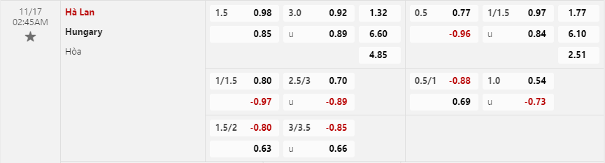Soi kèo hiệp 1 Hà Lan vs Hungary: 0.88*0.75*0.69
