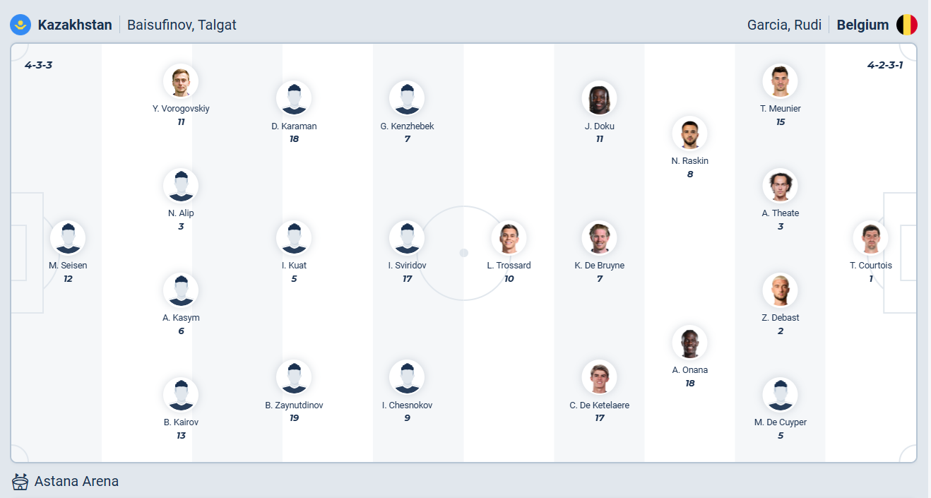 Kazakhstan không phải đội bóng mạnh của khu vực châu Âu, họ chưa từng vào vòng chung kết của giải đấu nào và thường bị loại sớm từ vòng sơ loại. Vòng loại World Cup năm nay cũng không phải ngoại lệ khi Kazakhstan đã chắc chắn bị loại trước 1 lượt trận, chính vì vậy trận đấu với tuyển Bỉ với họ chỉ còn tính chất thủ tục. Trong khi đối thủ mạnh hơn nhiều và vẫn cần chiến thắng nên sẽ không có gì ngạc nhiên nếu Kazakhstan không thể hiện được gì nhiều và thua đậm trận này.
