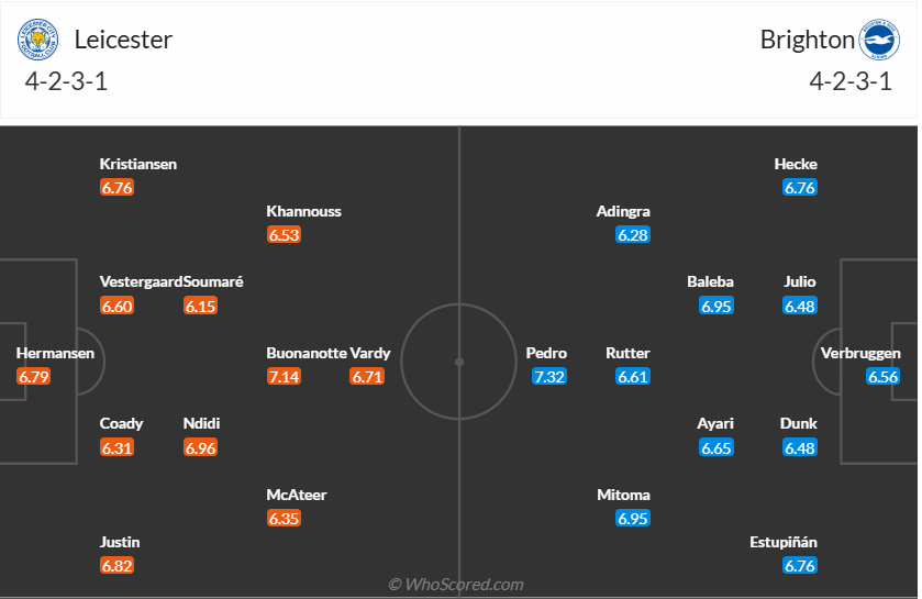 Leicester ngay trận đấu đầu tiên dưới thời tân HLV Ruub van Nisterooy đã có chiến thắng rất ấn tượng trước West Ham, chiến thắng đó chấm dứt chuỗi trận toàn hòa và thua của đội bòng này đồng thời giúp họ leo lên vị trí thứ 16 trên bảng xếp hạng. Với mục tiêu trụ hạng thì các cầu thủ Leicester cần tiếp tục tích lũy điểm số để đủ điểm ở lại Premier League, nên khi tiếp đón Brighton trên sân nhà thì Leicester muốn có ít nhất 1 điểm. Trong bối cảnh đội khách đang có phong độ không ổn định thì nhiều khả năng đội chủ nhà sẽ có điểm trận này.