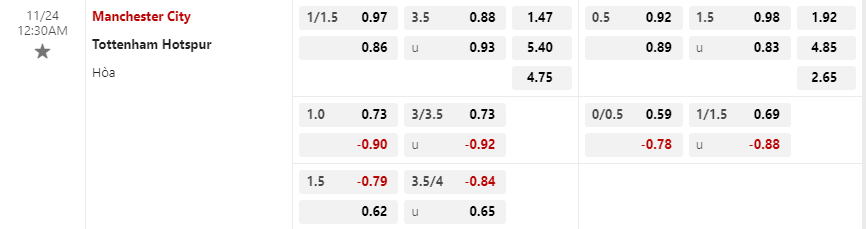 - Soi kèo châu Á Manchester City vs Tottenham Hotspur: 0.90*1.0*0.73