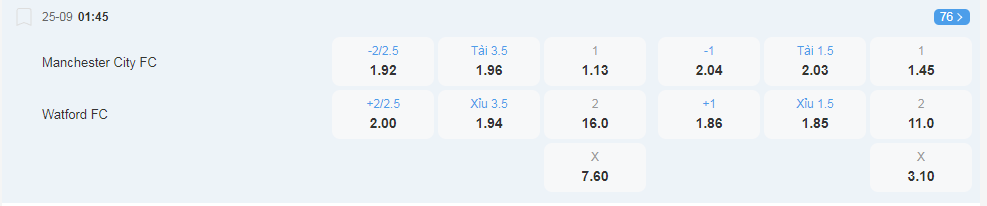 Tỷ lệ kèo Manchester City vs Watford