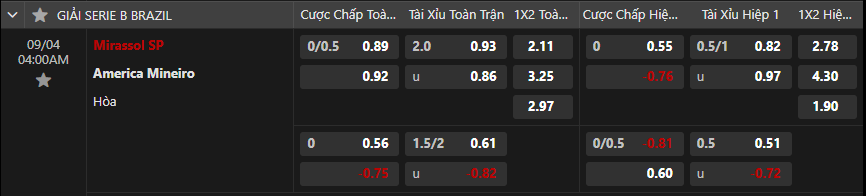 Soi kèo châu Á Mirassol vs America Mineiro