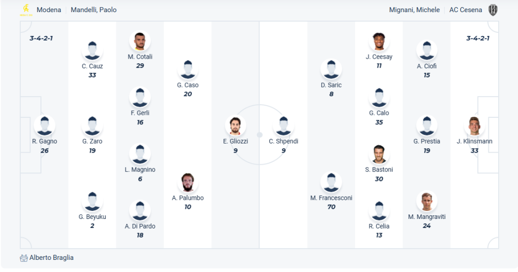 Cesena là đội bóng mới thăng hạng mùa này từ Serie A, dù mới thăng hạng nhưng đội bóng của HLV Michele Mignani lại chơi rất thành công khi đứng thứ 8 ở thời điểm mùa giải sắp kết thúc. Rõ ràng đội bóng này không phải nghĩ đến việc trụ hạng và đó đã là một mùa giải thành công. Sau chuỗi trận không tốt thì Cesena đã chơi rất ổn ở 2 vòng gần nhất với 2 chiến thắng, 2 chiến thắng đó giúp các cầu thủ Cesena rất tự tin trong các trận còn lại của mùa giải. Đến làm khách trên sân của Modena vào lúc này không phải trận đấu quá khó khăn và nhiều khả năng Cesena sẽ ra về với 3 điểm trọn vẹn.