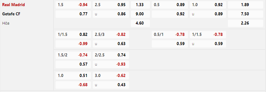 Soi kèo hiệp 1 Real Madrid vs Getafe: 0.78*0.75*0.59
