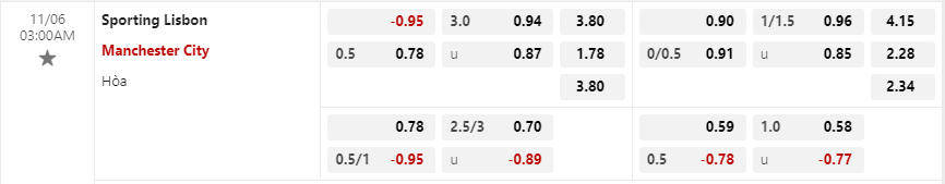 Soi kèo châu Á Sporting Lisbon vs Manchester City: 0.78*-0.5*0.95